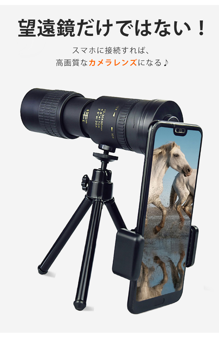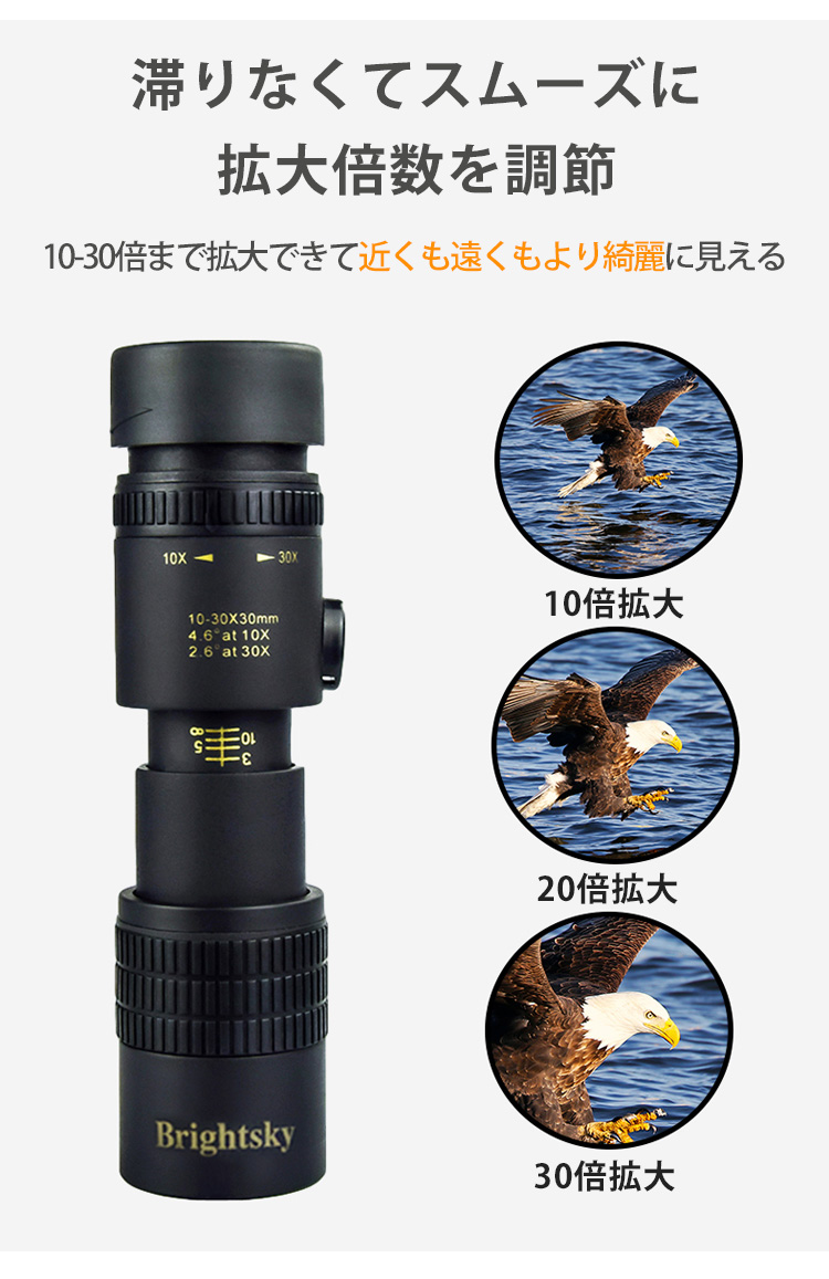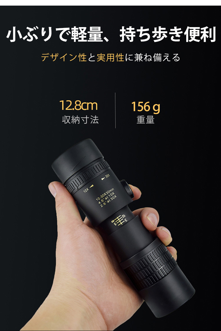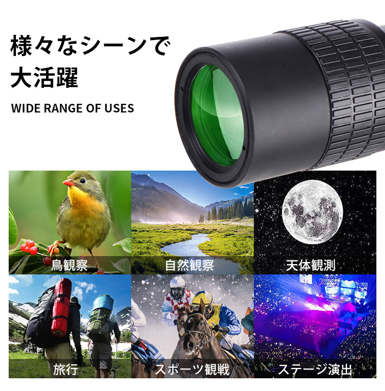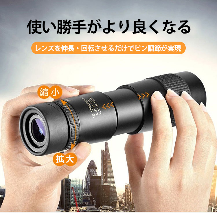 【単眼望遠鏡】伸縮可能、伸長・旋回でピン調節、使用方法が簡単、カメラとして使える、FMCコーティング