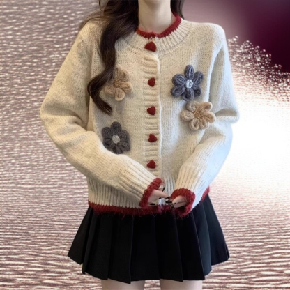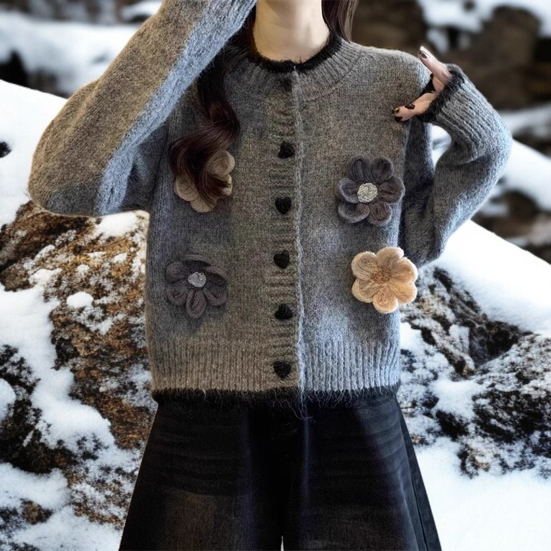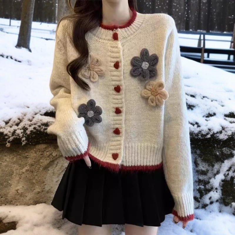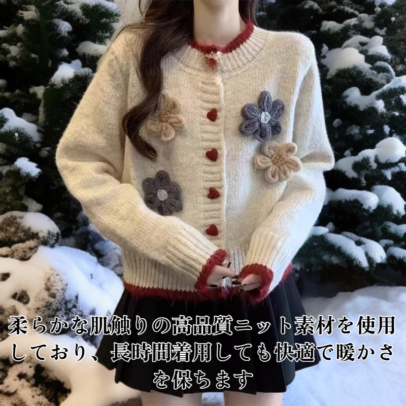 レディース ハートボタン フラワー 長袖 カーディガン セーター
